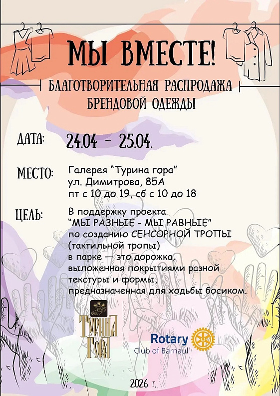 «В дни благотворительной распродажи галерея «Турина гора» превращается в бутик брендовой одежды, предоставленный известными магазинами и барнаульскими модницами. А это широчайший ассортимент мужской, женской, детской одежды, а также аксессуаров и украшений, которые можно приобрести по цене от 100 до 3000 рублей. По традиции все собранные средства от продажи мы аккумулируем и тратим на благотворительные нужды», — пояснила куратор галереи «Турина гора» Екатерина Левина.