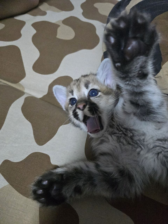 На фотоподборке, которую опубликовал в своих социальных сетях зоопарк, видно, как подрос котёнок — у него пушистые лапки, красивые пятнышки по всему телу, полоски на пузике и голубые глаза.