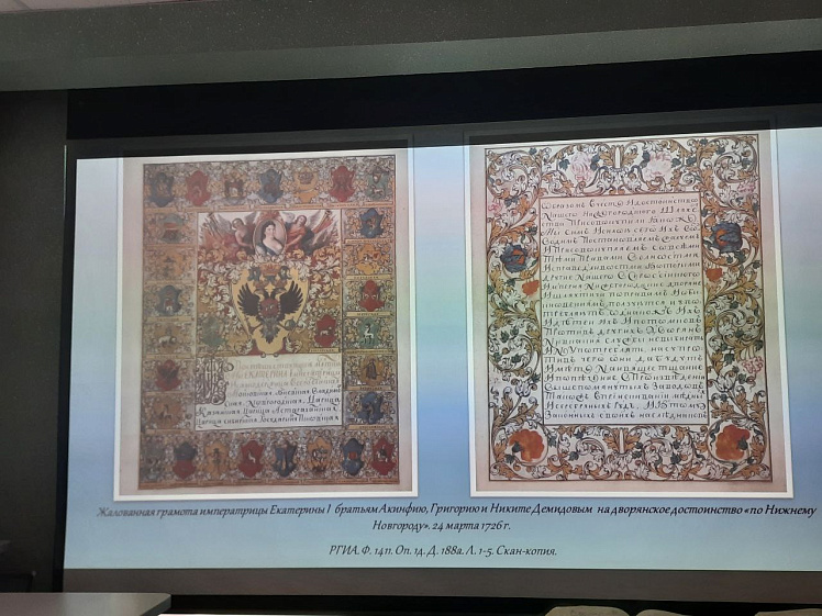 — Этим документом Екатерина I подтверждала Акинфию Демидову, его родным и их потомству дворянское достоинство, ранее пожалованное их отцу Никите Демидову. Грамота давала право пользования всеми вольностями и справедливостями, положенными дворянам. Но было существенное условие — говорилось, что их детей и потомков ни в какие другие службы не выбирать, кроме как в попечение вышеупомянутых заводов, так же и при искании медных и серебряных руд. Таким образом, все потомки Демидовых должны были заниматься именно заводским делом. Той же грамотой был утверждён герб рода Демидовых и дано его описание. И в заключение Екатерина указывала, «чтобы помянутых Демидовых и их законных наследников всегда в вечные времена за дворян держали, признавали и почитали», — дала пояснение к документу специалист архива.
