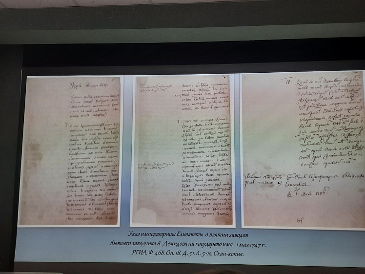 О документах подробно рассказала Дарья Полякова, начальник отдела использования и публикации документов. Среди них разрешение Берг-коллегии, выданное Акинфию Демидову на разработку месторождений меди в окрестностях Колывани, датированное 16 февраля 1726 года, от которого ведётся отсчёт истории горнозаводского производства на Алтае.