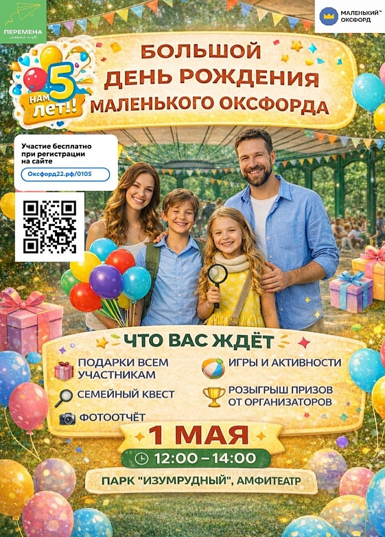 1 мая в парке «Изумрудный» (пр. Комсомольский, 128) с 12:00 до 14.00 барнаульцев и гостей города ждёт праздник в честь пятилетия детского образовательного центра. Программа рассчитана на детей от 3 до 14 лет и их родителей. Их ждут игры и активности, семейный квест, розыгрыш призов, подарки каждому участнику и фотоотчёт. Участие бесплатное, но необходима регистрация