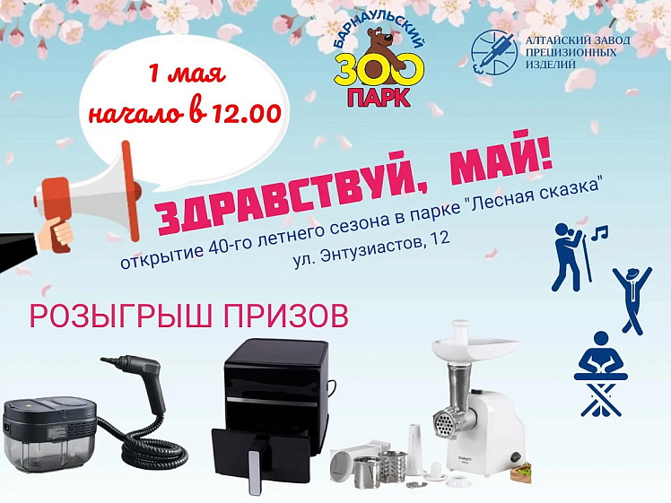 В парке аттракционов «Лесная сказка» (ул. Энтузиастов, 12) 1 мая также начнут работать аттракционы. С 12:00 до 14:00 здесь будут работать игровые площадки. Интерактивная площадка Объединения детских центров Алтайского края и розыгрыш призов на главной сцене состоятся в это же время. Посетить ярмарку декоративно‑прикладного творчества можно будет с 12:00 до 16:00. С 14:00 до 16:00 продлится музыкально‑игровая программа с творческим коллективом «Февраль» и школой танцев INFLAME.