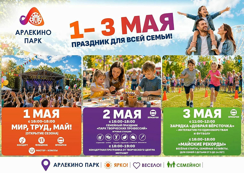 Парк «Арлекино» (ул. Г. Исакова, 149а) с 16:00 до 18:00 1 мая приглашает на концертную программу «Мир. Труд. Май». Гостей ждут выступления творческих коллективов, выставка работ мастеров декоративно-прикладного творчества. С 15:00 до 18:00 гости парка смогут посетить мастер-класс по созданию изделий из стабилизированного мха. В финале состоится весёлый флеш-моб от команды «Киндер-Фест».