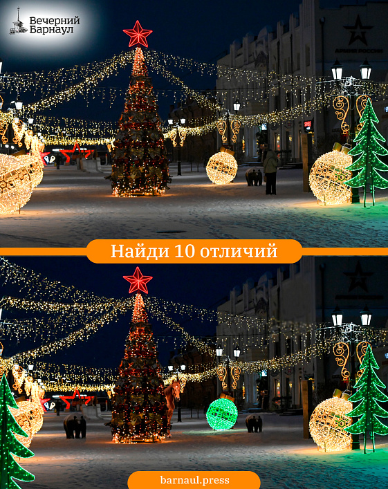 Чтобы ваши новогодние каникулы стали ещё ярче, приглашаем вас принять участие в традиционной игре «Вечернего Барнаула». Необходимо найти десять отличий на фотографиях улицы Мало-Тобольской.