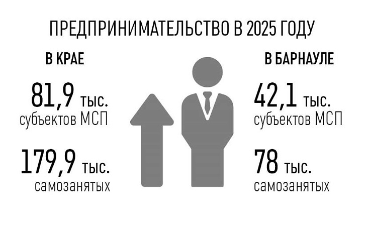 Экономика региона складывается силами малого и среднего предпринимательства, и по итогам 2025 года их число достигло почти 82 тысяч — это исторический максимум. Причём чуть больше половины из них действуют в Барнауле. На 10 января по данным единого реестра субъектов МСП на территории краевой столицы осуществляют деятельность 42 102 субъекта бизнеса. Город прирос 1240 предпринимателями. Помимо этого, количество самозанятых росло в геометрической прогрессии и на начало года составило 77 984 человека, из них в 2025 году зарегистрировались 17 814 человек.