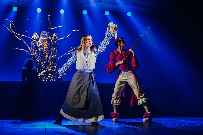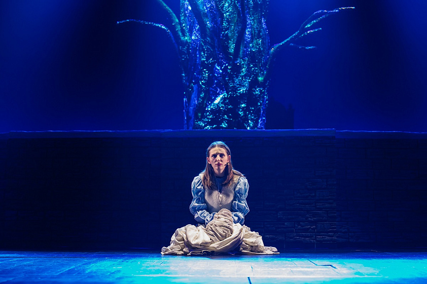 Сказочное пространство спектакля создано очень эффектно. Артём Терёхин вместе с художником-постановщиком Софьей Кобозевой придумали, что действие сказки происходит внутри книги, которая стоит на сцене.