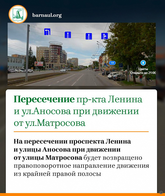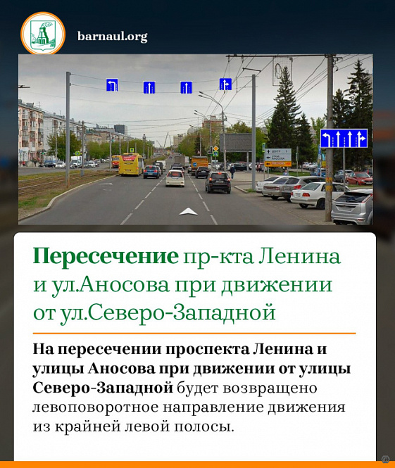 На пересечении проспекта Ленина и улицы Аносова при движении от улицы Матросова будет возвращено правоповоротное направление движения из крайней правой полосы, при движении от улицы Северо-Западной вернут левоповоротное направление движения из крайней левой полосы.