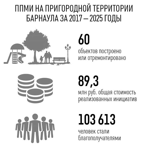 Барнаул активно участвует в краевом проекте поддержки местных инициатив (ППМИ) с 2017 года. За это время на пригородной территории краевой столицы реализовано 60 инициативных проектов: 27 — по ремонту автомобильных дорог, 22 — по обустройству детских и спортивных площадок, 11 — по организации уличного освещения. В 2026 году ещё девять инициатив барнаульцев вошли в число победителей конкурсного отбора и получат финансовую поддержку из краевого и городского бюджетов.
