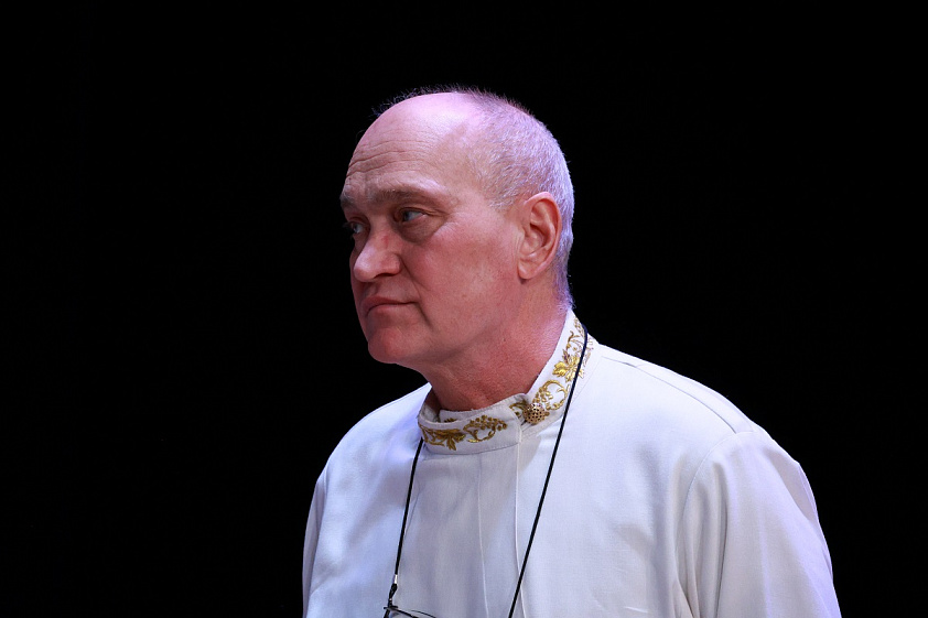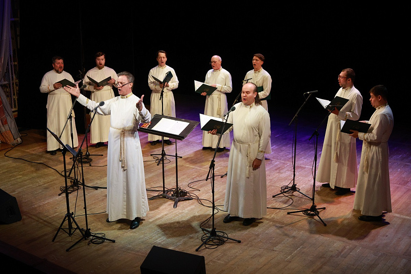 — Наши солисты обладают не только вокальными, но и личностными качествами. А личностные качества — это очень такая опасная тема, с погружением в психологию. Я скажу только одно, что на концертной эстраде церковному и особенно монастырскому хору нужно вести себя так, как он ведёт себя на службе. И соблюдать все каноны исполнения на сцене, как будто для тебя не существует публики в зале. И чтобы певец умел отдавать свой внутренний мир через свой голос. То есть в храме, в монастыре певчий должен вести себя и работать ровно так, как он работает на концертной эстраде. Это два таких сообщающихся сосуда, и ни один из них не должен быть пустым. Поэтому храм мы переносим на концертную эстраду, концертную эстраду мы переносим в храм. Это не с точки зрения самого действа, а это с точки зрения душевного состояния каждого человека в хоре. Вот тогда может состояться «консенсус» между исполнителями и прихожанами в храме, и слушателями в концертах, — поделился регент хора.