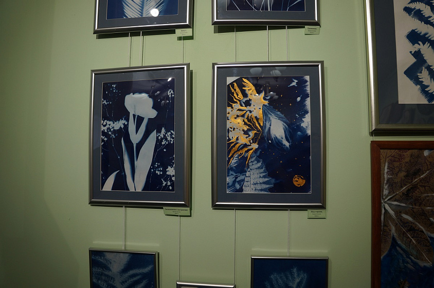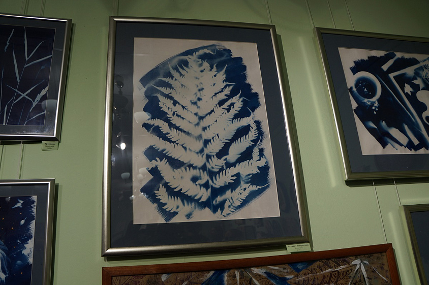 — Это, по сути, фотограммы растений. Их создавала без ультрафиолетового света — в тёмной комнате. Методика проста и сложна одновременно: на бумагу наносится светочувствительный раствор. Продумывается игра с тенью. Согласно задуманному изображению укладываются растения, сверху помещается стекло, и работа выставляется на свет. Под воздействием ультрафиолета фон картины окрашивается в особый синий оттенок, а наложенные предметы остаются белоснежными, — делится нюансами техники Олеся Южкова.