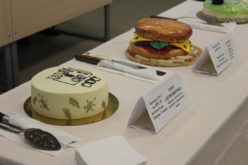 Первокурсникам Егору Белкину и Ульяне Поповой с помощью жеребьёвки досталась кафедра технологии хранения и переработки зерна. Профиль кафедры они тоже раскрыли в оформлении, а не составе торта — это шоколадный бисквит с заварным кремом «пломбир» и внешним слоем из крем-чиза.