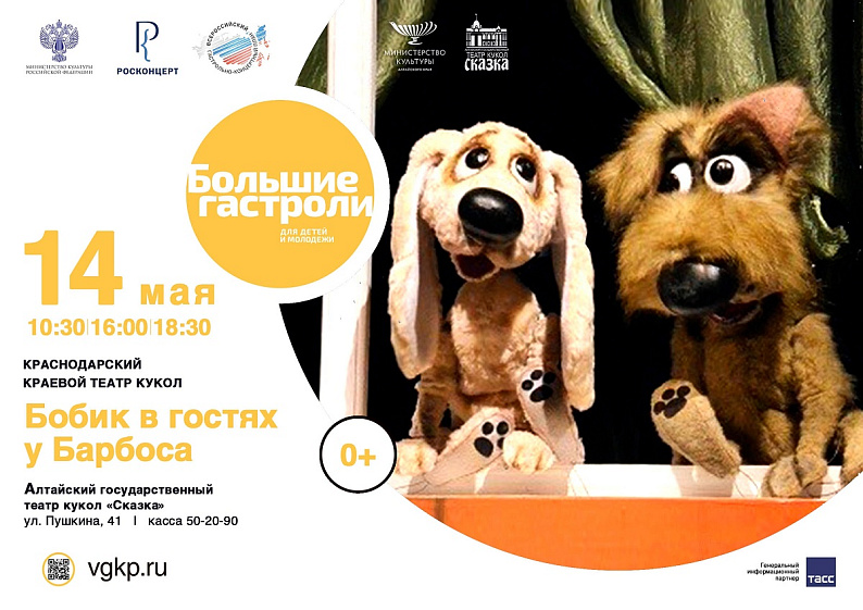 В рамках направления по поддержке детских и молодёжных театров кукольники Краснодарского края покажут барнаульцам спектакли «Мойдодыр» (0+), «Бобик в гостях у Барбоса», «Баллада о Руслане и Людмиле» («У Лукоморья») (12+).