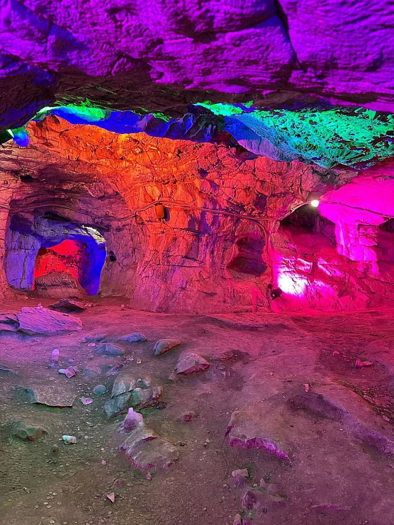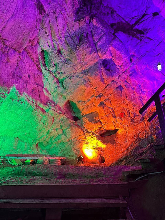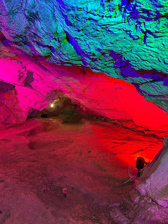 На протяжении 150 метров пешеходного маршрута установлена аддитивная система синтеза света (метод, основанный на смешении цветовых излучений), которая за счёт высокотехнологичных LED-ламп и программного управления освещает каждую зону 16-тью миллионами оттенков. Всего установлено более 80 световых приборов, которые создают уникальную атмосферу внутри пещер.