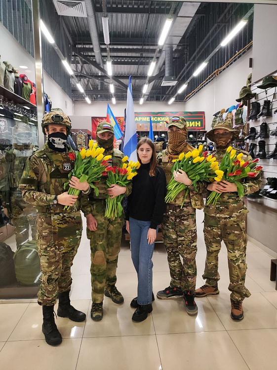 Вручили цветы девушкам курсанты военно-патриотического клуба «Струна», который базируется на базе колледжа АлтГУ.