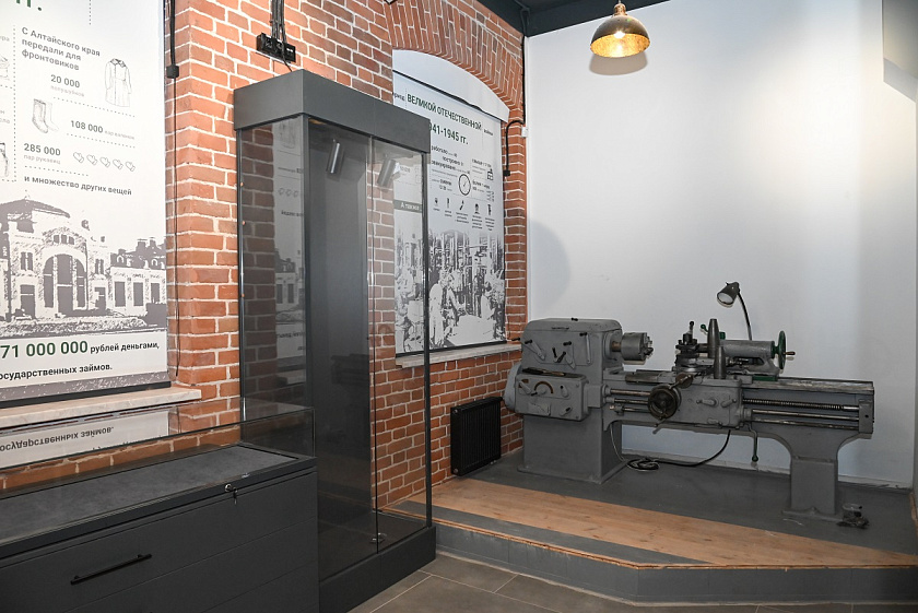 — Наша задача — показать в этом зале роль и вклад Алтайского края в Победу. Мы не забываем, что продовольствием и оружием фронт обеспечивали тыловые регионы. По задумке зал будет погружать посетителей в атмосферу, в которой жили люди. В избе будет сидеть почтальон, которая принесла повестку или сообщение о гибели бойца. На таких станках, как наш, делали боеприпасы, а установленное на потолке мультимедийное оборудование позволит на втором плане показать цех завода, в котором были установлены десятки таких станков и сутками работали люди, — рассказала Наталья Вакалова.