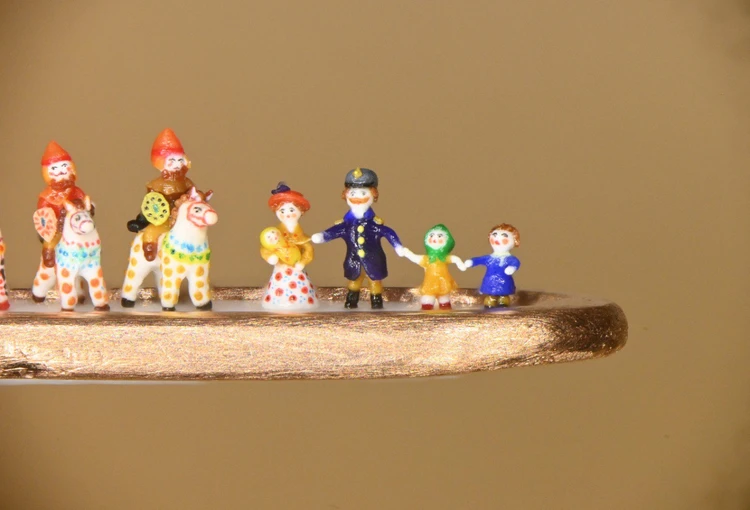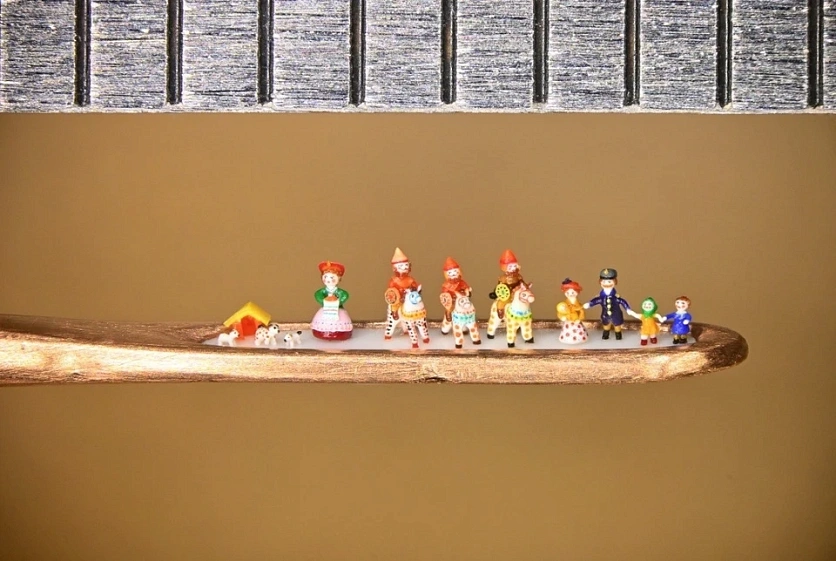 Как сообщает «КП-Новосибирск», высота игрушек варьируется от 0,16 мм (собачка) до 1 мм (богатырь на коне). Работа над композицией заняла, по словам мастера, месяц.
