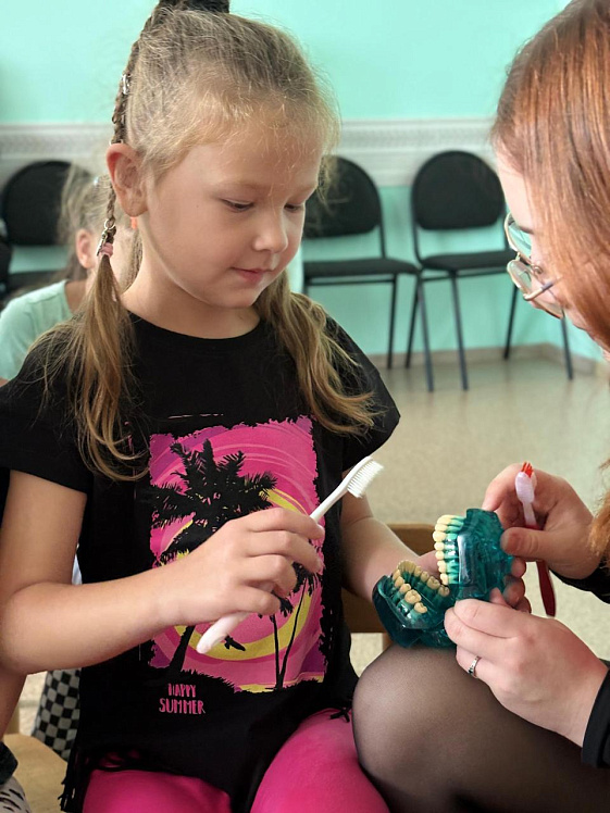 Будущие врачи в игровой форме прививают малышам привычку заботиться о здоровье своих зубов. На занятиях они используют яркие наглядные пособия: большие модели челюстей, плакаты с весёлыми картинками и огромный муляж зубной щётки. Каждый ребёнок с его помощью тренируется делать правильные движения и осваивает технику чистки зубов. С детьми также ведут живой диалог, рассказывая о полезных и вредных продуктах.