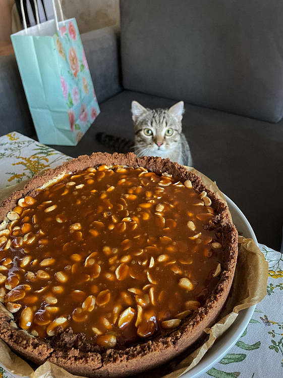 Торту и карамели дайте остыть. Затем достаньте десерт из формы, сверху распределите арахис и залейте карамелью.