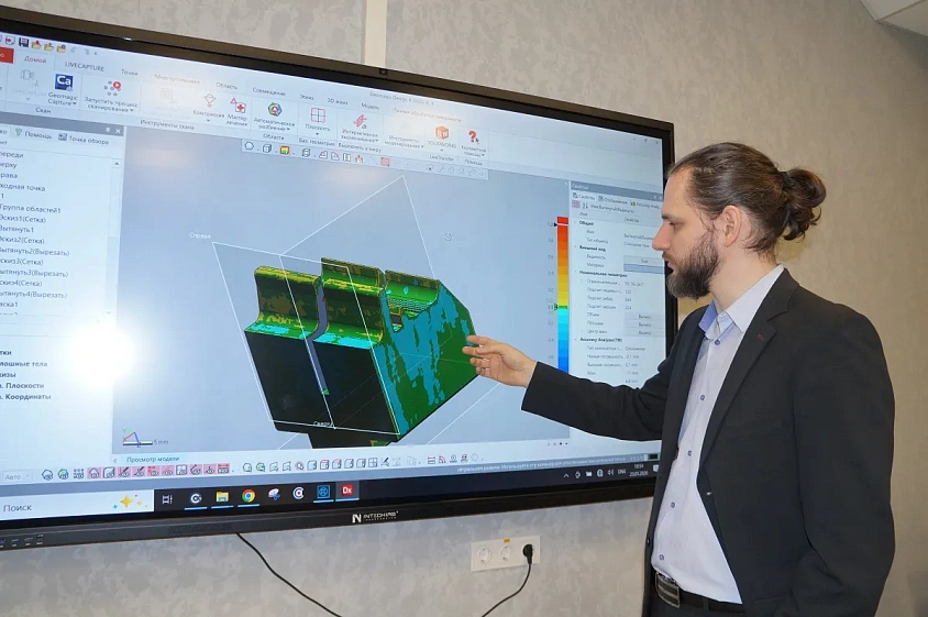— Любые погрешности программа покажет в цвете. К примеру, задав допустимые отклонения в 0,02 мм, мы видим, что в зелёный цвет окрасились грани, которые стоят в этом допуске. Все жёлтые оттенки — отклонения в чуть большем размере. То, что идёт в холодный спектр, меньше 0,02 мм, но в обратной степени, — поясняет разработчик. — То есть мы можем выполнить обратный процесс: оценить компьютерную модель по качеству изготовления.