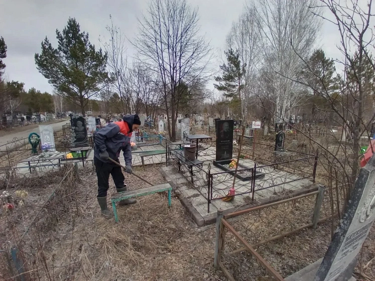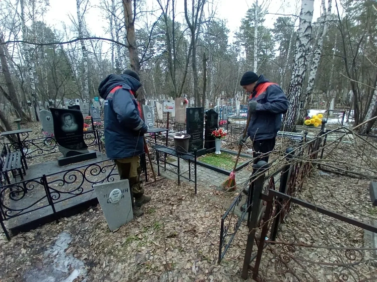 Специалисты МБУ «Специализированная похоронная служба» Барнаула проводят работы по санитарной очистке мест захоронения ветеранов Великой Отечественной войны, они убирают мусор, ветки и сухую листву.