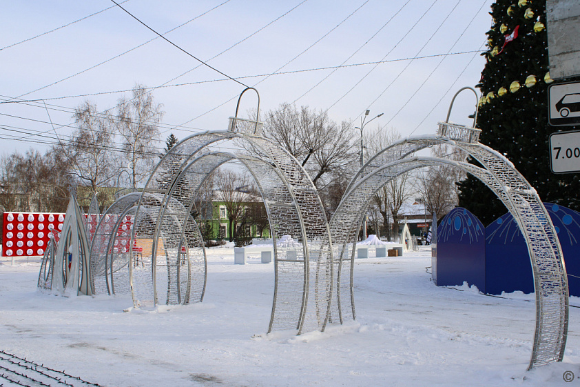 В настоящее время специалисты подключают светодинамические фигуры и монтируют световую иллюминацию. Позже здесь установят фигуры Деда Мороза и Снегурочки.
