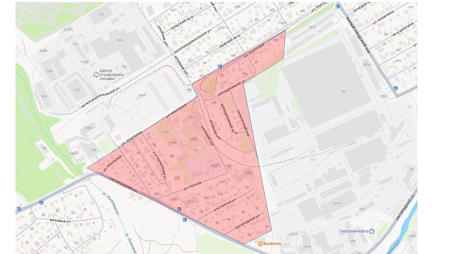 Водоснабжение будет отсутствовать — с 9:00 17 марта до 9:00 18 марта у части жителей центральной части города — в границах улиц Анатолия, Загородной и переулка Поперечного. В зону отключения попадут восемь многоквартирных домов, 132 частных дома, 1 бойлерная, детский сад №63 и шесть административных зданий — на улице 2-й Тормозной, в переулке Крайнем, Ипподромном проезде, Ипподромной улице, а также на участках улиц Гоголя, Кустарной и Загородной (зона отключения выделена красным на схеме).