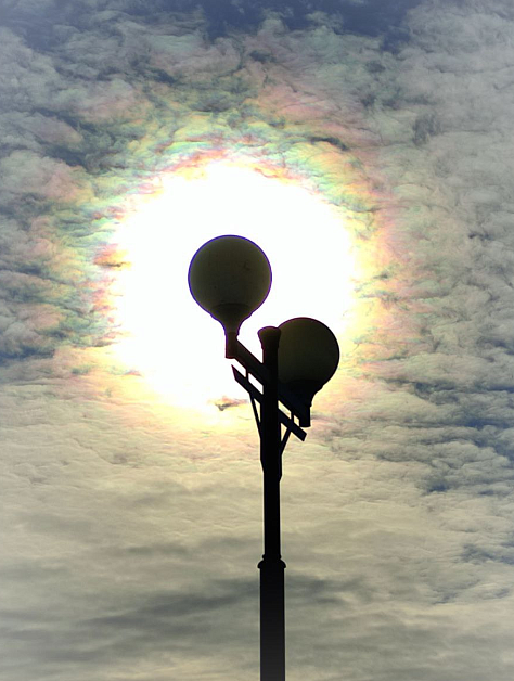 «Иризация и венцы — это, по сути, одно и то же физическое явление, просто выглядит по-разному. Венцы — это кольца вокруг солнца. Иризация — это живописные радужные пятна на облаках в стороне от светила (часто на их краях). Но причина одна — дифракция света на мельчайших частицах облака», — пояснил эксперт телеканалу «Саратов 24».