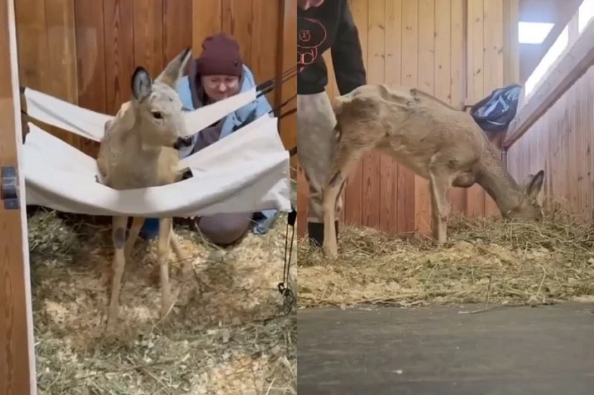 По словам добровольца, животное не ходит: косуля чувствует ноги, стоит, но пока не может их согнуть. С ней работает реабилитолог, делает сгибание-разгибание ног, массажи.