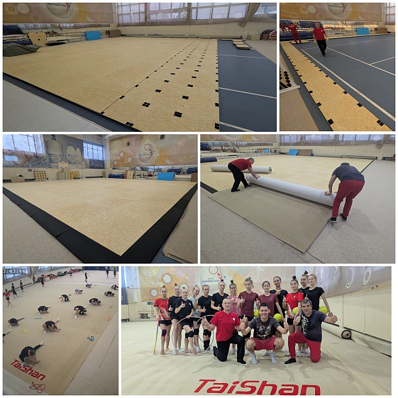 Ковёр с помостом, который используют для выравнивания основания пола и создания комфортных условий для занятий — он гарантирует мягкое приземление после элементов, особенно прыжков, приобрели в конце прошлого года, а 5−6 января оборудование было собрано.