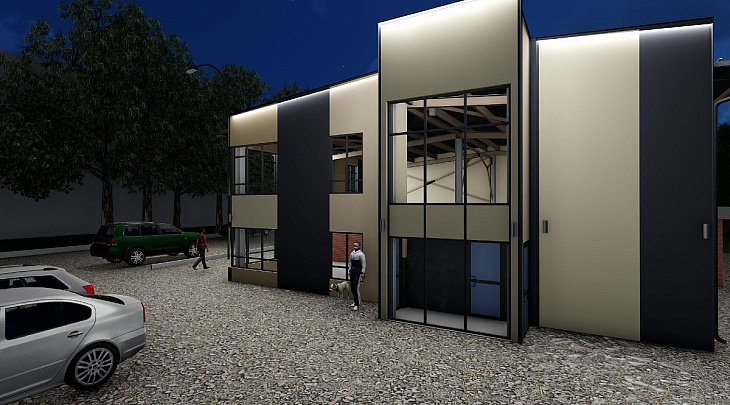 Здание пристройки и надстройки изначально планировали в бело-синих тонах с отделкой из сэндвич-панелей. На первом этаже разместят кабинеты, планировка второго этажа — свободная. Авторам рекомендовали доработать проект. Ряд изменений был внесён. Так, изменилась цветовая гамма строения — оно будет графитовым с вставками оттенка слоновой кости. На кровле установят снегозадержатели, а по фасаду сделают водосток. В эскизном проекте также добавили лист с развёртками по улицам.