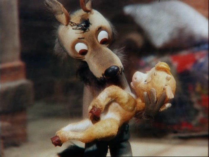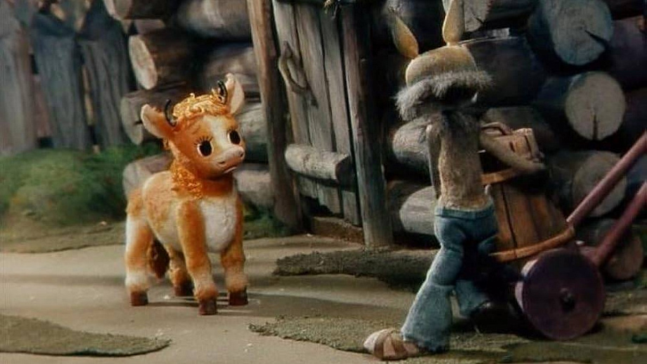 Кукольный мультфильм был создан в 1984 году режиссёром-мультипликатором Михаилом Каменецким.В финале хищники собираются силой отобрать у Волка-отца Телёнка, но он баррикадирует дверь и угрожающе рычит. Кульминацией мультфильма становится явление подросшего Телёнка, ставшего крепким бычком, который разгоняет троицу. Волк, схватив на руки бычка, радостно кричит: «Сынок!», а тот в ответ говорит: «Папаня!». «Ну вот, то-то! А то мама, мама!» — ответил ему Волк и засмеялся.