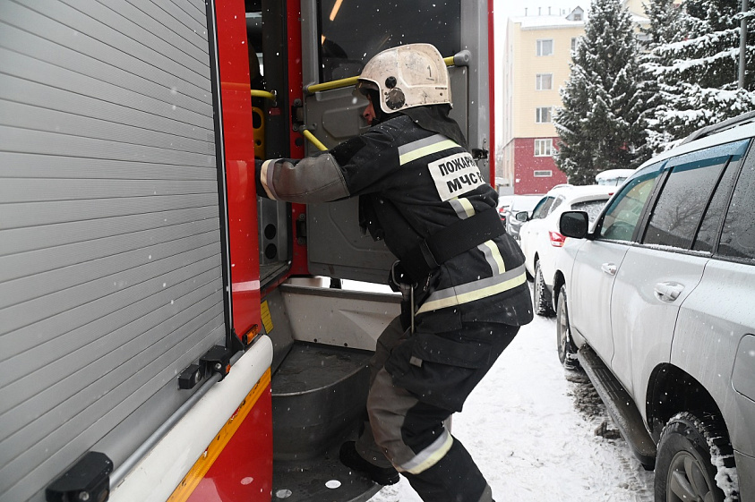 Если во время тренировки поступает сигнал о пожаре — отделения собираются и едут. С поступления сообщения до выезда проходит не больше минуты. По нормативу, на одежду дается 20 секунд. Но — мы посчитали — сотрудники первой пожарной части справляются даже чуть быстрее.