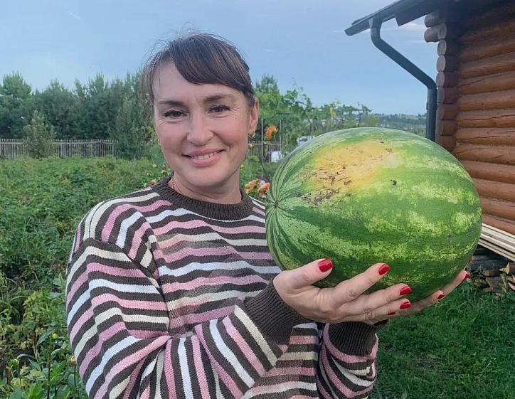 В руках у Татьяны Райских увесистая полосатая ягода. Арбуз при стуке ладонью по поверхности издает мелодичный спелый звон — полностью вызрел и готов к употреблению. Капризную бахчу садовод выращивает на участке на протяжении многих лет.