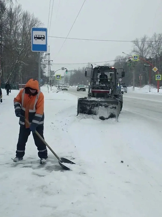 Зимнее содержание проезжих частей и пешеходных дорожек проводится во всех районах Барнаула. В этих работах 23 февраля 2026 года заняты 90 человек и 91 единица спецтехники.
