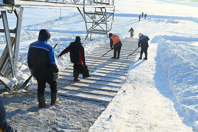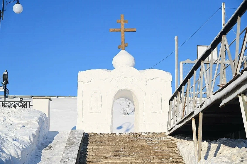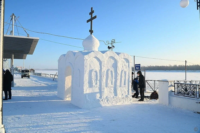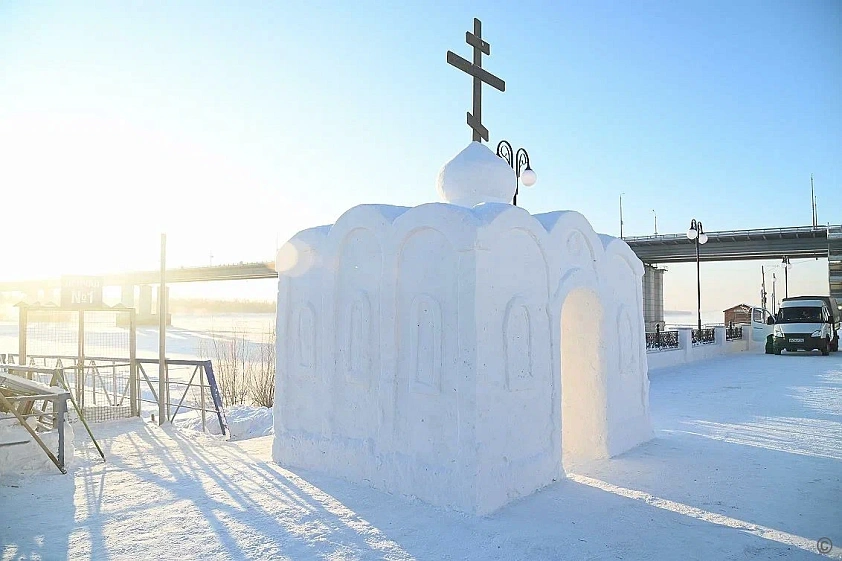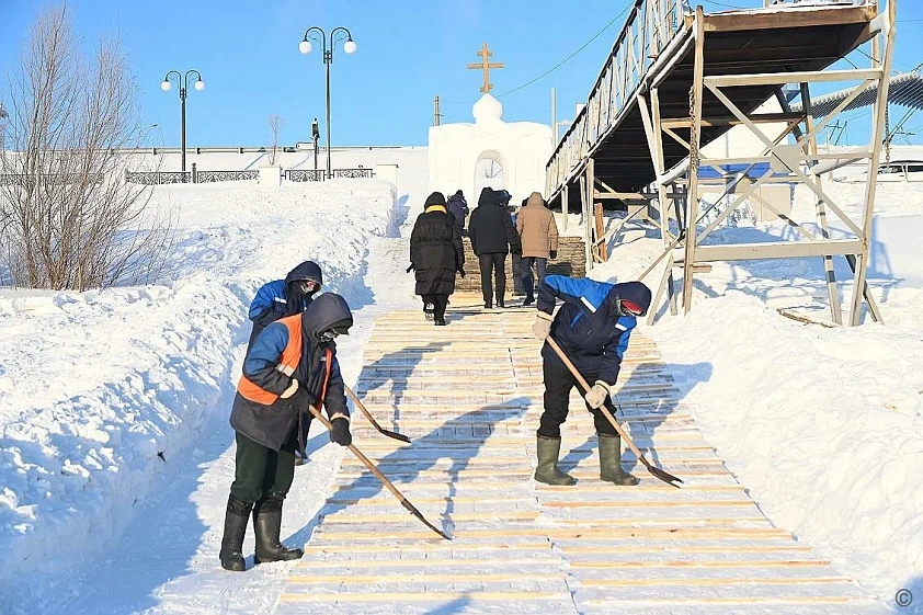 На территории купели на реке Обь специалисты «Барнаулгорсвета» установили временное освещение. Работники «Благоустройства и озеленения» вместе с подрядчиками возвели снежную часовню и мостки для удобного подхода к воде. Сейчас продолжаются работы по обустройству купели и ледяного креста.