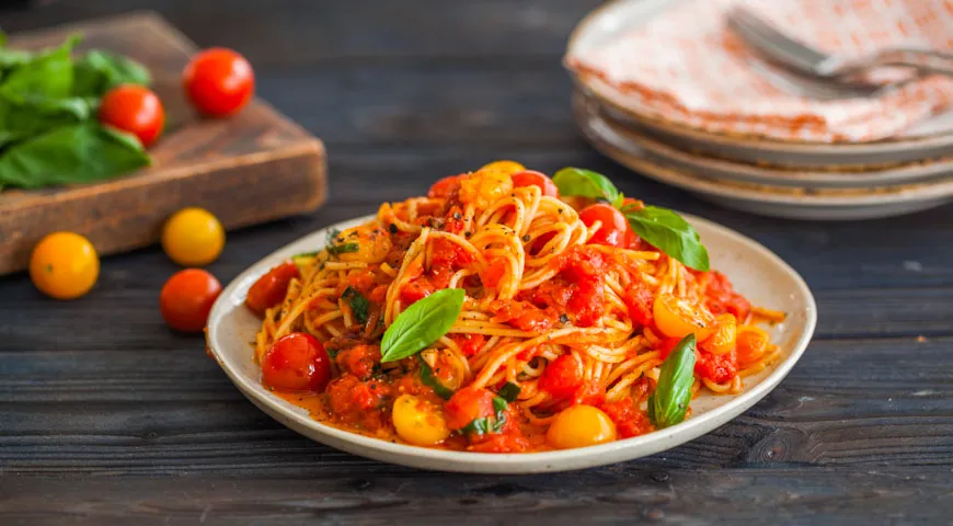 Как приготовить: для томатного соуса раздавите и очистите чеснок. В большую сухую разогретую сковороду налейте оливковое масло, положите чеснок. Добавьте помидоры вместе с соком и листочки базилика, оставив несколько для украшения. Доведите до кипения, приправьте солью, перцем и сахаром, томите 5–7 минут на среднем огне. В самом конце добавьте черри, разрезанные пополам и дайте соусу настояться, пока варится паста. Сварите спагетти согласно инструкции на упаковке в большом количестве кипящей подсоленной воды, уменьшив время приготовления на 3 минуты. Подготовленную пасту и 150–200 мл отвара от пасты добавьте в томатный соус, перемешайте и готовьте в соусе на среднем огне ещё 3 минуты. Разложите пасту по подогретым тарелкам, украсьте базиликом.