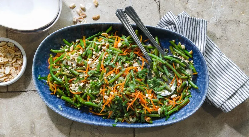 Требуется: 600 г стручковой фасоли, 2 моркови, 0,25 ст. арахиса, очищенного и обжаренного, 5–7 веточек свежей кинзы, 1 луковица, 60 мл растительного масла без запаха, 2 лайма, 2 ст. л. рыбного соуса, 1 ч. л. сахара, 1 ч. л. паприки, 0,5 ч. л. кайенского перца, соль, чёрный молотый перец.