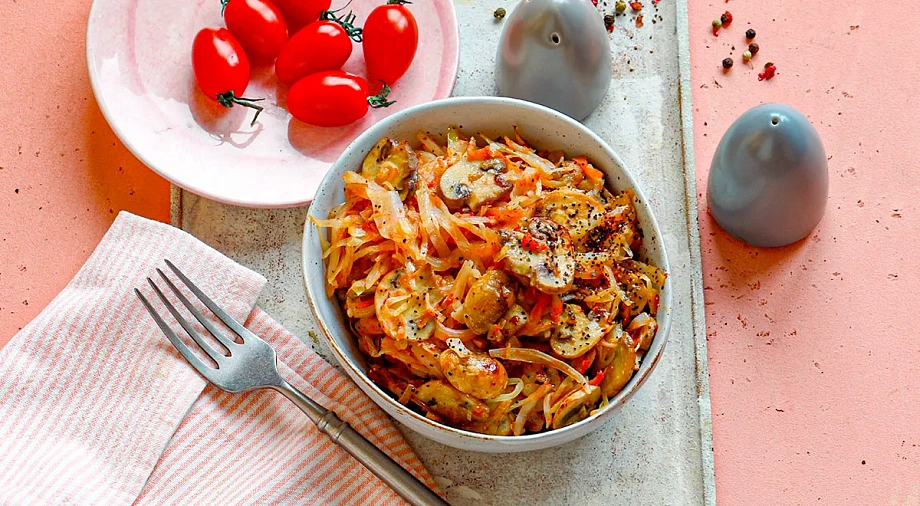 Требуется: небольшой кочан капусты, 500 г шампиньонов, 1 головка репчатого лука, 1 морковь, 200 г протёртых томатов, масло растительное, соль, перец и чеснок — по вкусу.