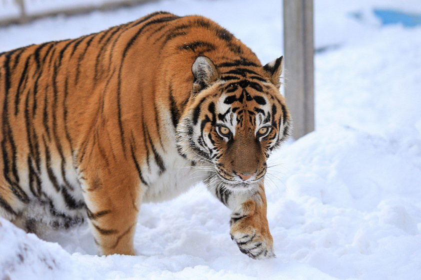 Кстати, у амурских тигров на шкуре меньше полос, чем у их собратьев, например бенгальских тигров. Густая шерсть делает тигра практически неуязвимым для суровых климатических условий севера, а плотный слой жира на брюхе обеспечивает хищнику защиту от студёного ветра и низких температур. Для нормального существования тигру нужно до 10 килограммов мяса в сутки.