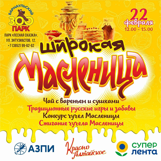В указанный промежуток времени в «Лесной сказке» будет работать ярмарка декоративно-прикладного творчества, интерактивная площадка движения «Vесточка из дома», игровые площадки, фотозоны. Ещё для посетителей организуют музыкально-игровую программу при участии образцового коллектива Алтайского края Студии народной музыки «Песнохорки», а также конкурс на лучшее чучело Масленицы. В 15:00 состоится сожжение символа зимы.