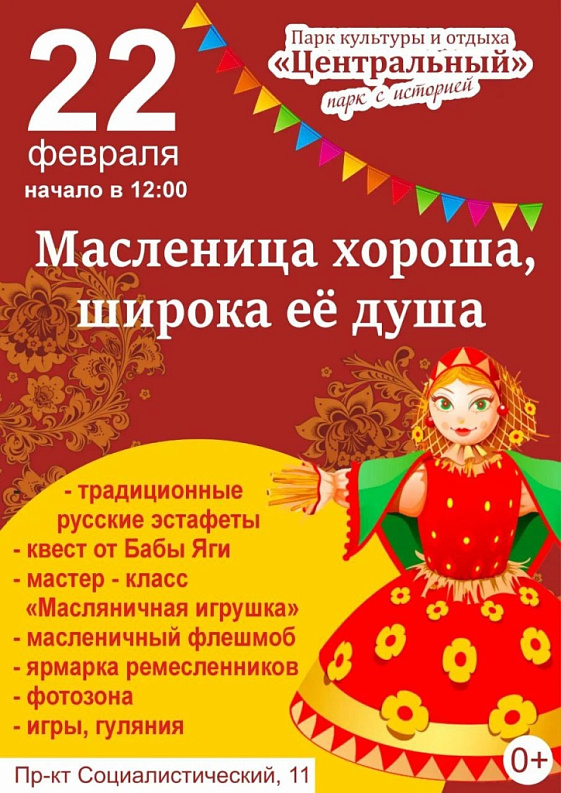 А в «Арлекино» начало мероприятий назначено на 14:00. До 17:30 там будут идти выступления творческих коллективов, народные игры и забавы, «Хороводы России», а в завершение мероприятия сожгут чучело Масленицы. Наиболее активные участники конкурса получат подарки.