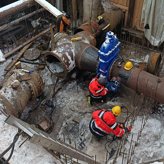 Так, в районе здания №83 специалисты смонтировали тройник и две задвижки диаметром 800 мм.