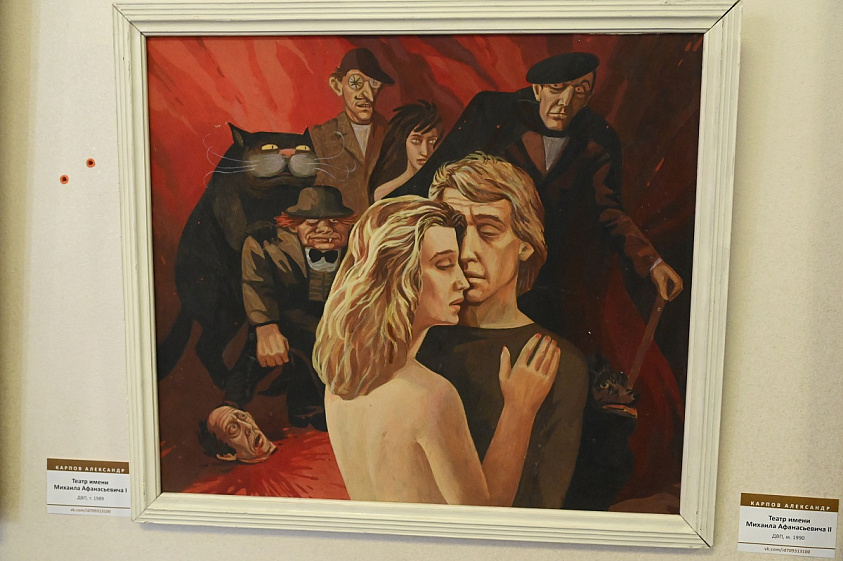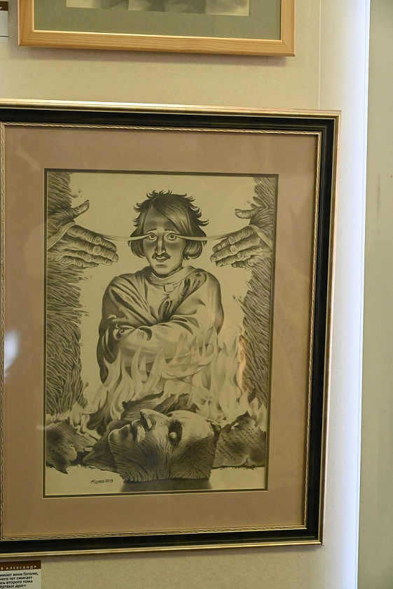 — На первой картине изображены Мастер и Маргарита, а также вся узнаваемая компания, — поделился Александр Александрович. — На второй — Левий Матфей, Понтий Пилат, часть тела распятого Христа — получилась некая вариация. Как в джазе, когда задана тема и начинается импровизация. С детских лет мне нравился также Николай Гоголь, отсюда и картина, где Вий открывает ему веки, а Гоголь после этого сжигает второй том «Мертвых душ». В жизни каждого знаменитого писателя и поэта было что-то фантасмагорическое, что влекло меня с детства и позже нашло отражение в картинах.
