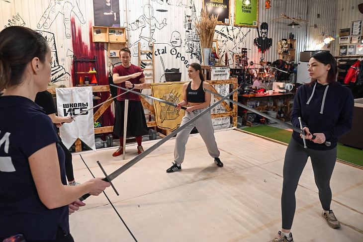 Нам на выбор предложили направления в зависимости от оружия — рапира или сабля и длинный (полуторный) меч. В руках первой оказалась рапира, она относится к классу колющих клинковых оружий, одна из разновидностей шпаг. Внешне похожа на те, что были у Д’Артаньяна и других мушкетёров, отличается более изящной фигурной рукоятью. Главная задаче в работе с таким клинком — уколоть соперника, поэтому тренер акцентирует внимание на том, чтобы острие всегда было направлено в сторону оппонента и тем самым создавало угрозу. Чтобы ловко управлять рапирой, должны быть гибкие и подвижные запястья. В отдельных движениях руку нужно изогнуть в такое положение, которое в обычной жизни вряд ли применяется.