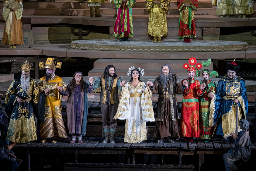 Режиссёр Франко Дзеффирелли известен своими классическими экранизациями («Ромео и Джульетта», «Гамлет» с Мелом Гибсоном), масштабными оперными постановками по всему миру. Его «Турандот», впервые показанная на сцене в 2010 году, — весьма характерная для его творческого стиля работа. Жизнерадостное буйство красок и масштаб декораций, как в каком-нибудь голливудском блокбастере, завораживает, массовка удивляет сплочённостью и достоверностью игры.