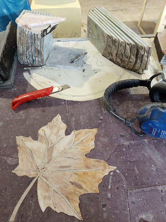 В качестве материала сибирские мастера выбрали белорецкий кварцит. Камень тёплого оттенка, от желтоватого до нежно-розового и кирпично-красного, украшен изысканными разводами холодных тонов.