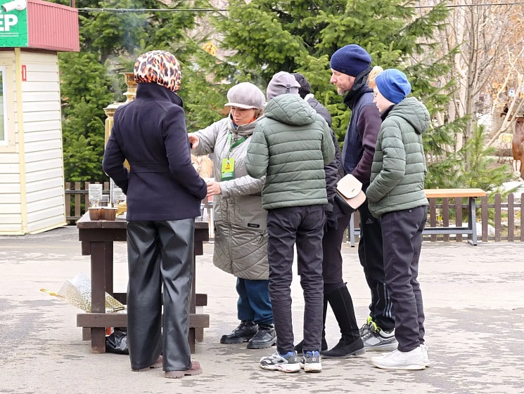 Так как погода была прохладная, всех желающих угощали травяным чаем из самовара и мёдом в сотах.