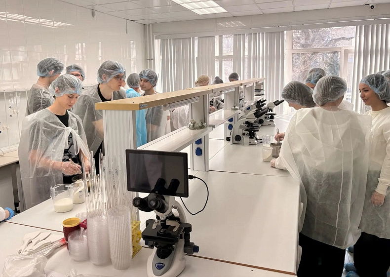 — Технологи молока изучают абсолютно всю продукцию, начиная от обычного молока и заканчивая сыром и прочими продуктами. У нас есть цеха для производства молочных консервов, плавленых сыров, мороженого, сырцех, кисломолочный цех и лаборатория качества. Наши студенты изучают сначала теорию, а потом проходят большой объём практических занятий, на которых сами вырабатывают различные продукты. Также у нас открыт свой научный клуб, в рамках которого мы разрабатываем новинки: творожные сырки с пчелиной пыльцой, йогурт с тыквой и многое другое, — рассказала участникам экскурсии Мария Гутова.