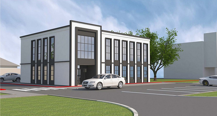 Боковые фасады глухие, чтобы была возможность пристройки в дальнейшем и создания комплекса зданий. У здания будет остекление с трёх сторон. Само строение возведут из металлокаркаса, с отделкой композитными материалами и штукатуркой. Предусмотрена подсветка здания в районе входной группы и по верхнему краю фасада.