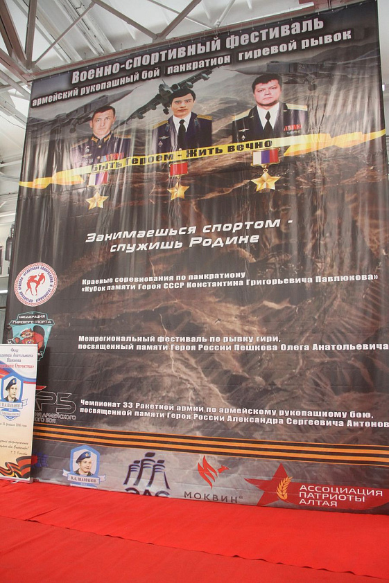В манеже АлтГТУ им. И.И. Ползунова перед Новым годом состоялся военно-спортивный фестиваль, объединивший три вида спорта. В его рамках прошли краевые соревнования по панкратиону памяти Героя СССР Константина Павлюкова, межрегиональный фестиваль по рывку гири памяти Героя России Олега Пешкова, а также чемпионат 33-й ракетной армии по армейскому рукопашному бою памяти Героя РФ Александра Антонова.